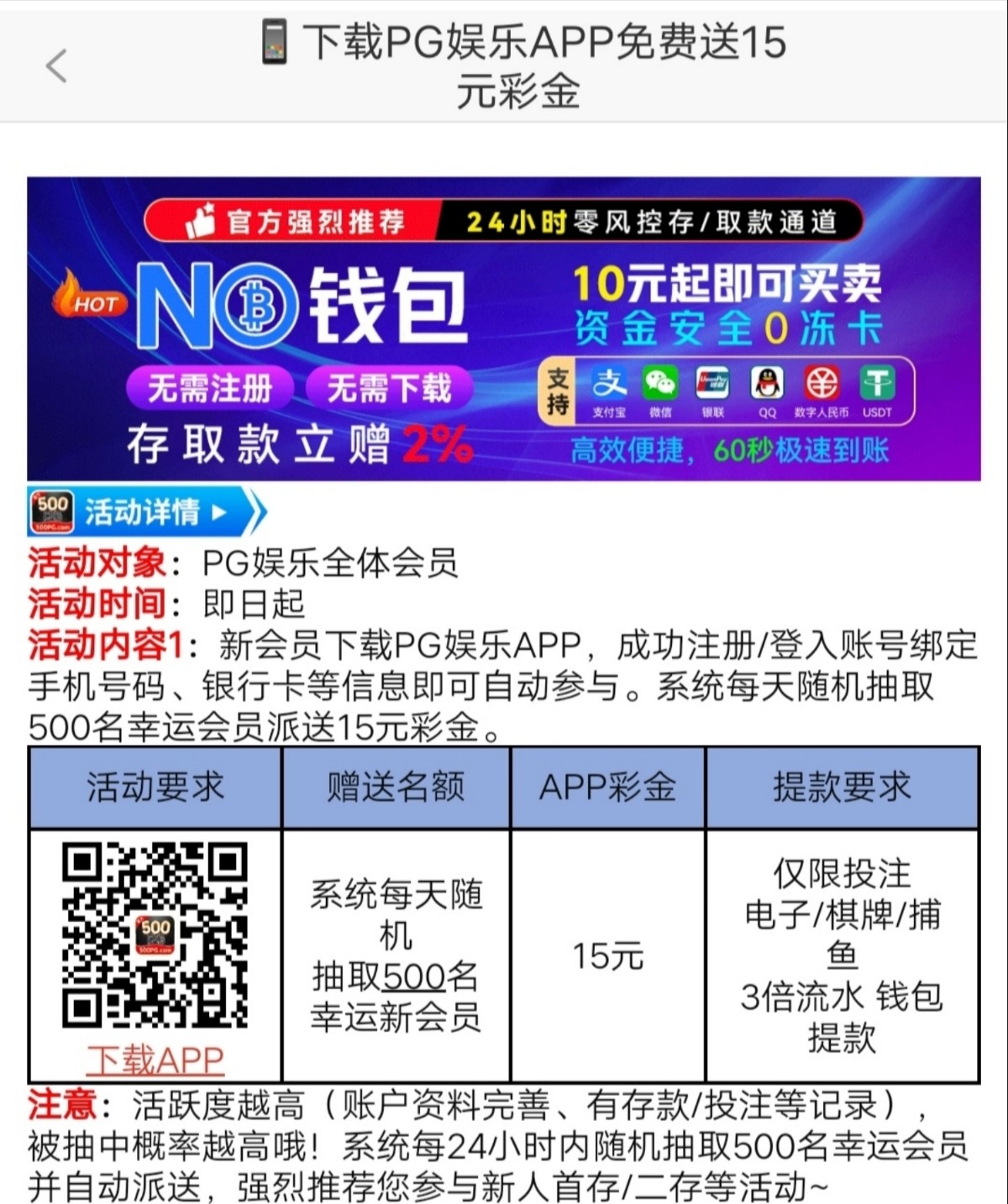新会员下载PG娱乐APP,成功注册/登入账号绑定手机号码、银行卡等信息即可自动参与。系统每天随机抽取500名幸运会员派送15元彩金。
