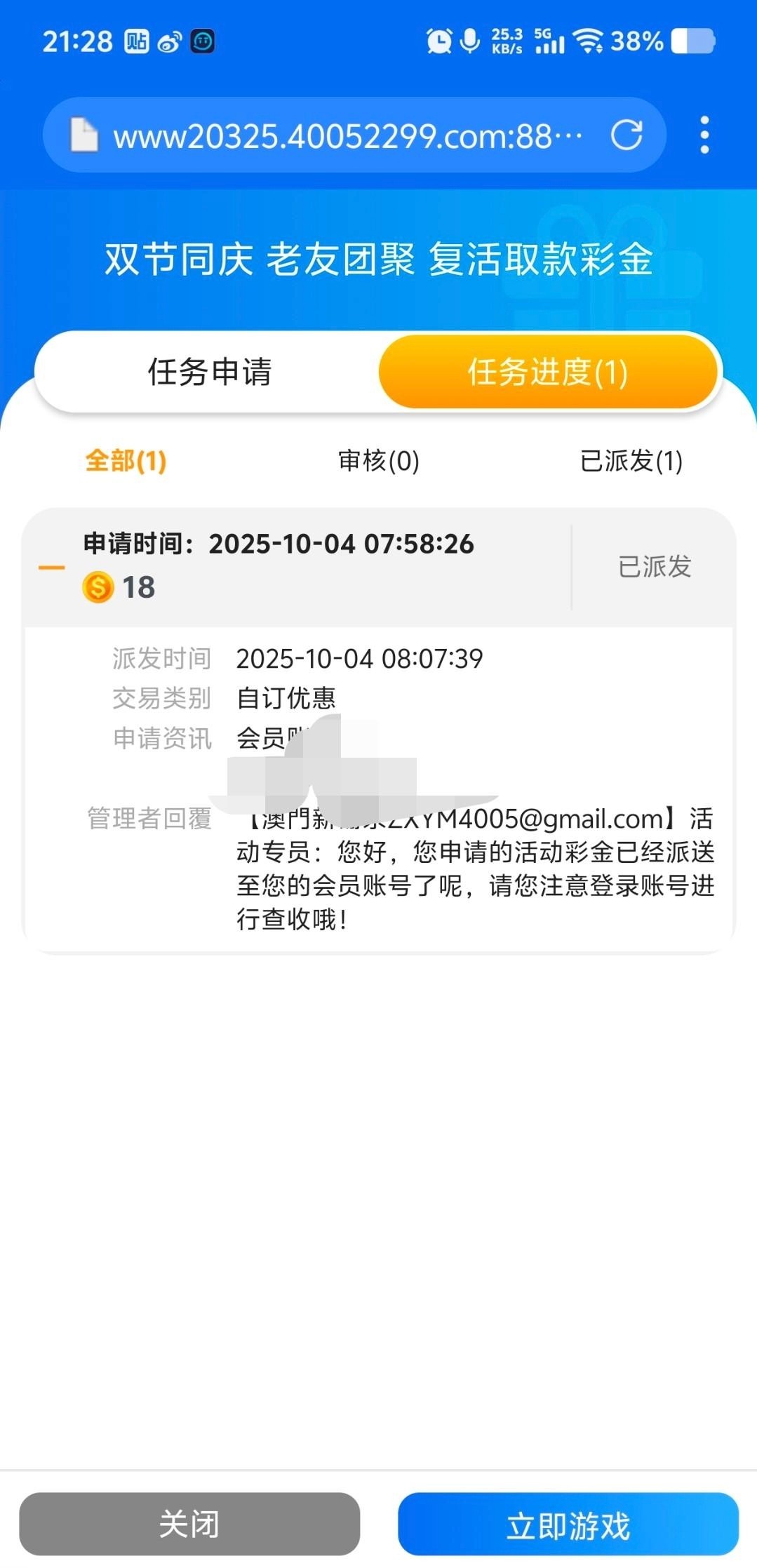 链接:4005.com根据提款记录进行回馈,我一年没玩了,回馈了18,没打出来,有玩过的老哥去申请试试。