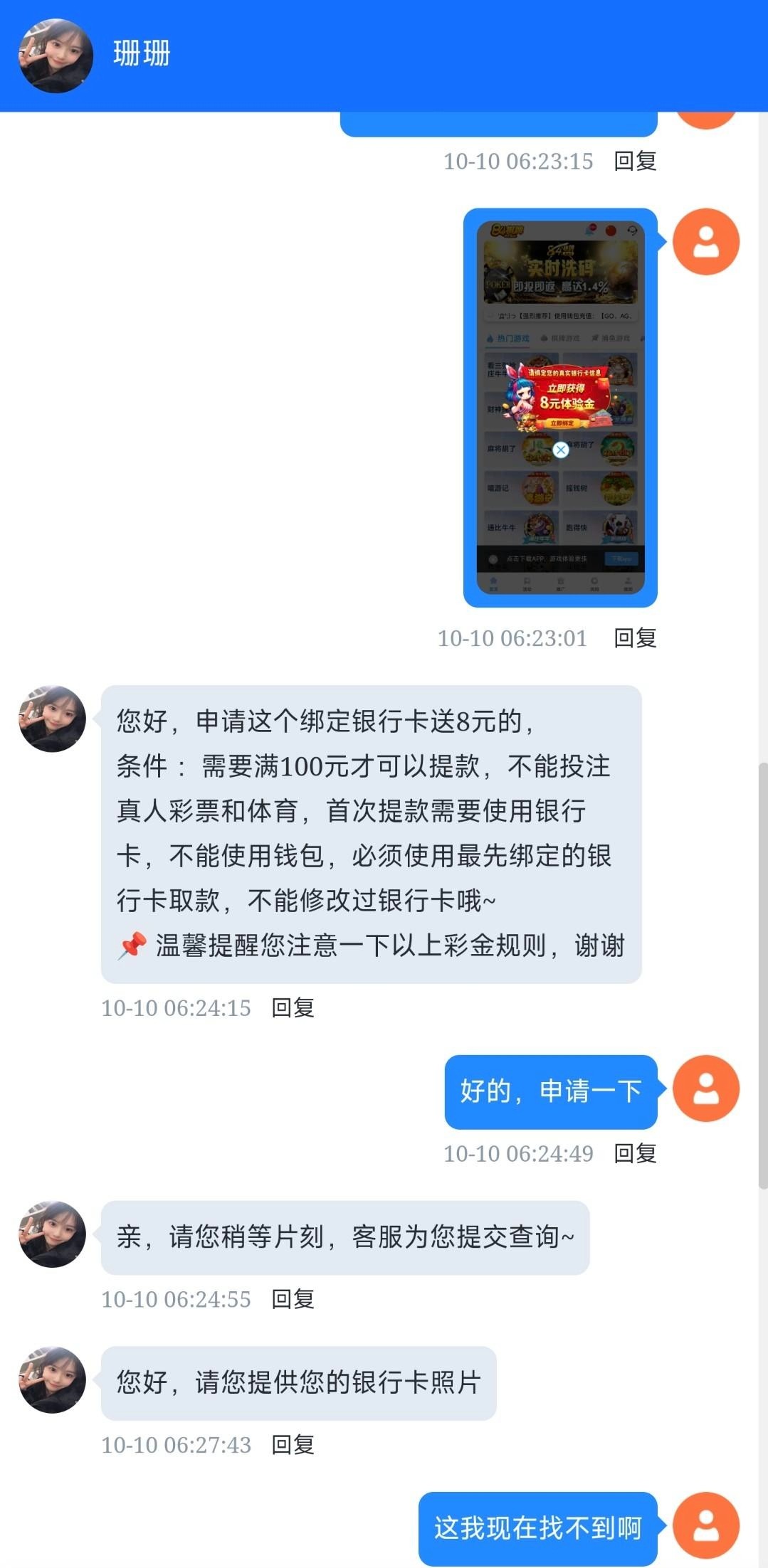 这时候去找在线客服说要申请这个彩金然后可能会要银行卡照片,提供不来的手机银行截图也行然后等待客服申请就到了