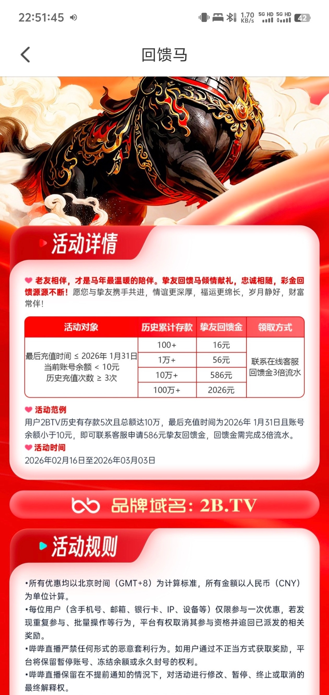 最近有充值符合要求去领,红包好像没有要求,可以先领红包等到账再领回馈马彩金,红包我领了16链接2B.TV