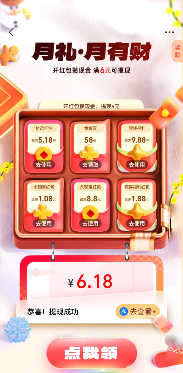 支付宝首页搜索月礼 主页进去做一个任务抽奖就够拿6.18无门槛红包